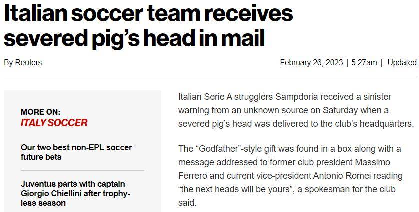 桑普多利亚刻下以2胜5平16负的倒霉战绩排在左迁区内,距离第17名的斯佩都亚有9分差距,有很高的左迁风险。据报说念,桑普高层费列罗、罗梅收到了一个邮件,皇冠体育代理内部是一个被砍下的猪头,况兼留言:“费列罗和罗梅,下一个头是你们的!”