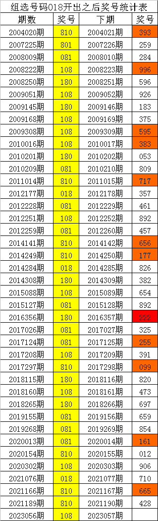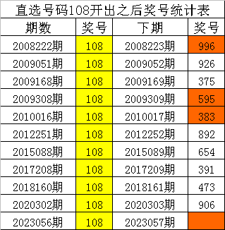 从上表统计不错看出,直选号码108开出之后,其下期奖号:
