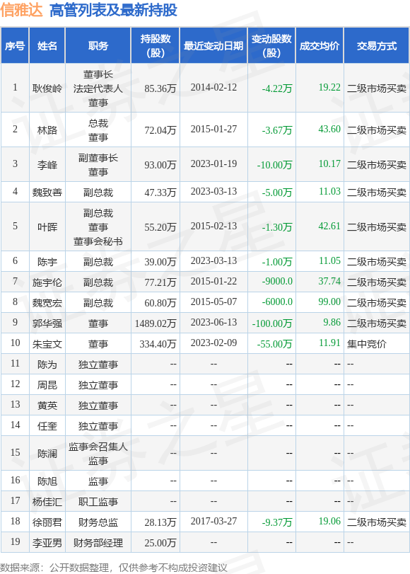 证券之星讯,左证6月14日市集公开信息、上市公司公告及来往所泄露数据整理,信雅达(600571)最新董监高及联系东说念主员股份变动情况:2023年6月13日公司董事郭华强共减捏公司股份100.0万股,占公司总股本为0.2083%。变动时辰公司股价高潮1.96%,6月13日当日收盘报9.89元。